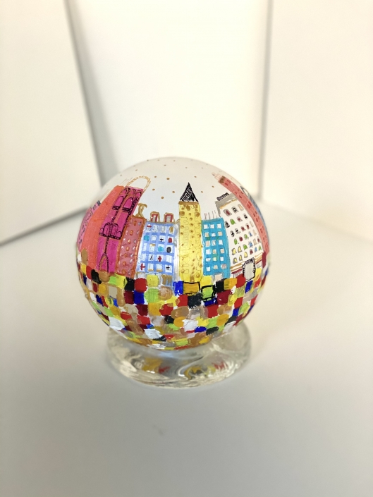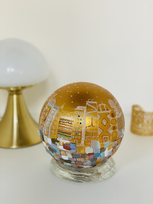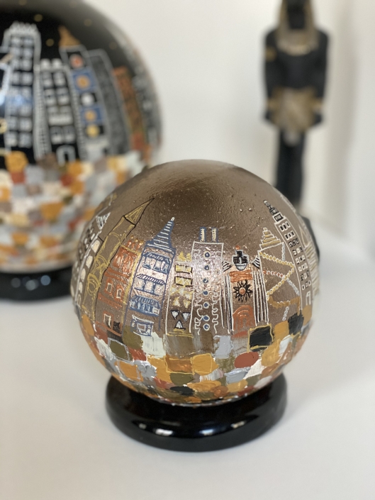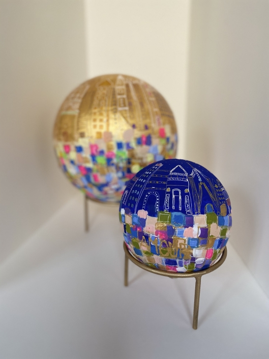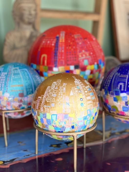 Ces globes que je fabrique et peins sont le symbole que nous tenons le monde entre nos mains. Je réinvente à travers ces sculptures des mondes meilleurs.